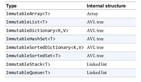大多数的immutable collections使用AVL树作为底层数据结构,这允许添加/删除操作重用原始内部结构的某些部分,而不必从头开始重新创建整个集合。这减少了添加/删除操作的开销,从潜在的大型(大型集合)到适度的大型,但它的代价是使读取操作变慢。最终的结果是,大多数不可变集合在读写方面都比可变集合慢。