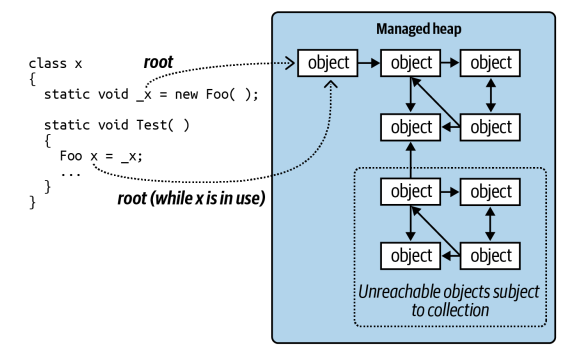 GC 从它的 root 对象引用开始,遍历对象图,将它接触到的所有对象标记为可访问的。当此过程完成时,所有未标记的对象将被视为未使用,并将受到垃圾回收的影响。