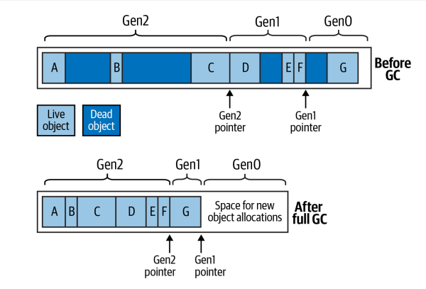 其余的“活动”对象随后被移动到堆的开始(压缩) ,从而为更多的对象释放空间。这种压缩有两个目的: 一是防止内存碎片,二是允许 GC 在分配新对象时采用一种非常简单的策略,即始终在堆的末尾分配内存。这可以防止维护一个空闲内存段列表这一可能非常耗时的任务。