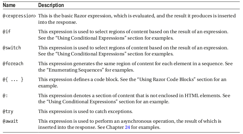 指令是指示 Razor 视图引擎的表达式。例如,@model 表达式是一个指令,它告诉视图引擎为视图模型使用特定的类型,而@using 指令告诉视图引擎导入名称空间。
