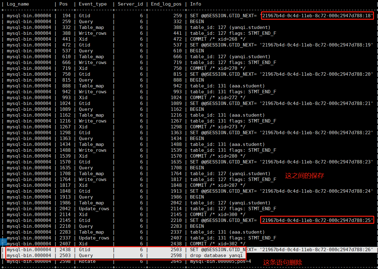 mysqlbinlog --skip-gtids --include-gtids='21967b4d-0c4d-11eb-8c72-000c2947d788:18-25' /opt/data/binlog/mysql-bin.000004 >/tmp/yanqi.sql