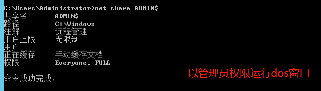 在源主机中,使用管理员权限运行dos窗口,执行:net share ADMIN$