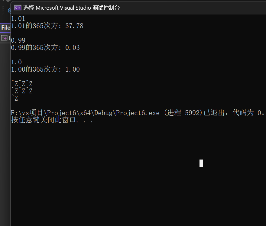 #include <stdio.h>#include <math.h>int main(){ double x, ans; while (scanf_s("%lf", &x) != EOF) { ans = pow(x, 365); printf("%.2f的365次方: %.2f\n", x, ans); printf("\n"); } return 0;}