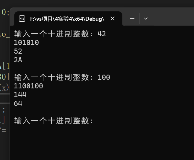 #include <stdio.h> #define N 100 void dec_to_n(int x, int n); // 函数声明 int main() { int x; printf("输入一个十进制整数: "); while (scanf("%d", &x) != EOF) { dec_to_n(x, 2); // 函数调用: 把x转换成二进制输出 dec_to_n(x, 8); // 函数调用: 把x转换成八进制输出 dec_to_n(x, 16); // 函数调用: 把x转换成十六进制输出 printf("\n输入一个十进制整数: "); } return 0; } void dec_to_n(int x, int n) { int i = -1, j; char A[17] = { "0123456789ABCDEF" }; int B[30]; while (x) { i++; B[i] = x % n; x /= n; } for (j = i; j >= 0; j--) { printf("%c", A[B[j]]); } printf("\n"); }