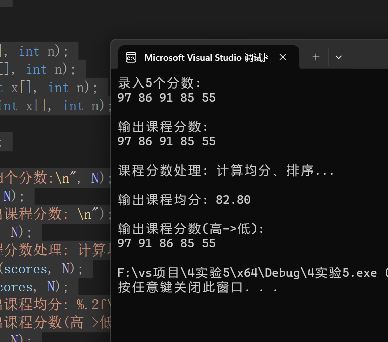 #include <stdio.h> #define N 5 // 函数声明 void input(int x[], int n); void output(int x[], int n); double average(int x[], int n); void bubble_sort(int x[], int n); int main() { int scores[N]; double ave; printf("录入%d个分数:\n", N); input(scores, N); printf("\n输出课程分数: \n"); output(scores, N); printf("\n课程分数处理: 计算均分、排序...\n"); ave = average(scores, N); bubble_sort(scores, N); printf("\n输出课程均分: %.2f\n", ave); printf("\n输出课程分数(高->低):\n"); output(scores, N); return 0; } // 函数定义 // 输入n个整数保存到整型数组x中 void input(int x[], int n) { int i; for (i = 0; i < n; ++i) scanf("%d", &x[i]); } // 输出整型数组x中n个元素 void output(int x[], int n) { int i; for (i = 0; i < n; ++i) printf("%d ", x[i]); printf("\n"); } double average(int x[], int n) { double j=0; int i; for ( i = 0; i <n; i++) { j += x[i]; } return (j / n); } void bubble_sort(int x[], int n) { int m,i,j; for ( i = 0; i <n; i++) { for ( j = 0; j <n; j++) { if (x[i]>x[j]) { m = x[i]; x[i] = x[j]; x[j] = m; } } } }