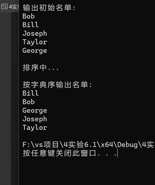 1 #include <stdio.h> 2 #include <string.h> 3 4 #define N 5 5 #define M 20 6 7 // 函数声明 8 void output(char str[][M], int n); 9 void bubble_sort(char str[][M], int n); 10 11 int main() { 12 char name[][M] = { "Bob", "Bill", "Joseph", "Taylor", "George" }; 13 int i; 14 15 printf("输出初始名单:\n"); 16 output(name, N); 17 18 printf("\n排序中...\n"); 19 bubble_sort(name, N); // 函数调用 20 21 printf("\n按字典序输出名单:\n"); 22 output(name, N); 23 24 return 0; 25 } 26 27 // 函数定义 28 // 功能:按行输出二维数组中的字符串 29 void output(char str[][M], int n) { 30 int i; 31 32 for (i = 0; i < n; ++i) 33 printf("%s\n", str[i]); 34 } 35 36 void bubble_sort(char str[][M], int n) { 37 int i, j; 38 char t[20]; 39 for (i = 0; i < n - 1; i++) 40 { 41 for (j = 0; j < n - 1 - i; j++) 42 { 43 if (strcmp(str[j], str[j + 1]) > 0) 44 { 45 strcpy(t, str[j]); 46 strcpy(str[j], str[j + 1]); 47 strcpy(str[j + 1], t); 48 } 49 } 50 } 51 }