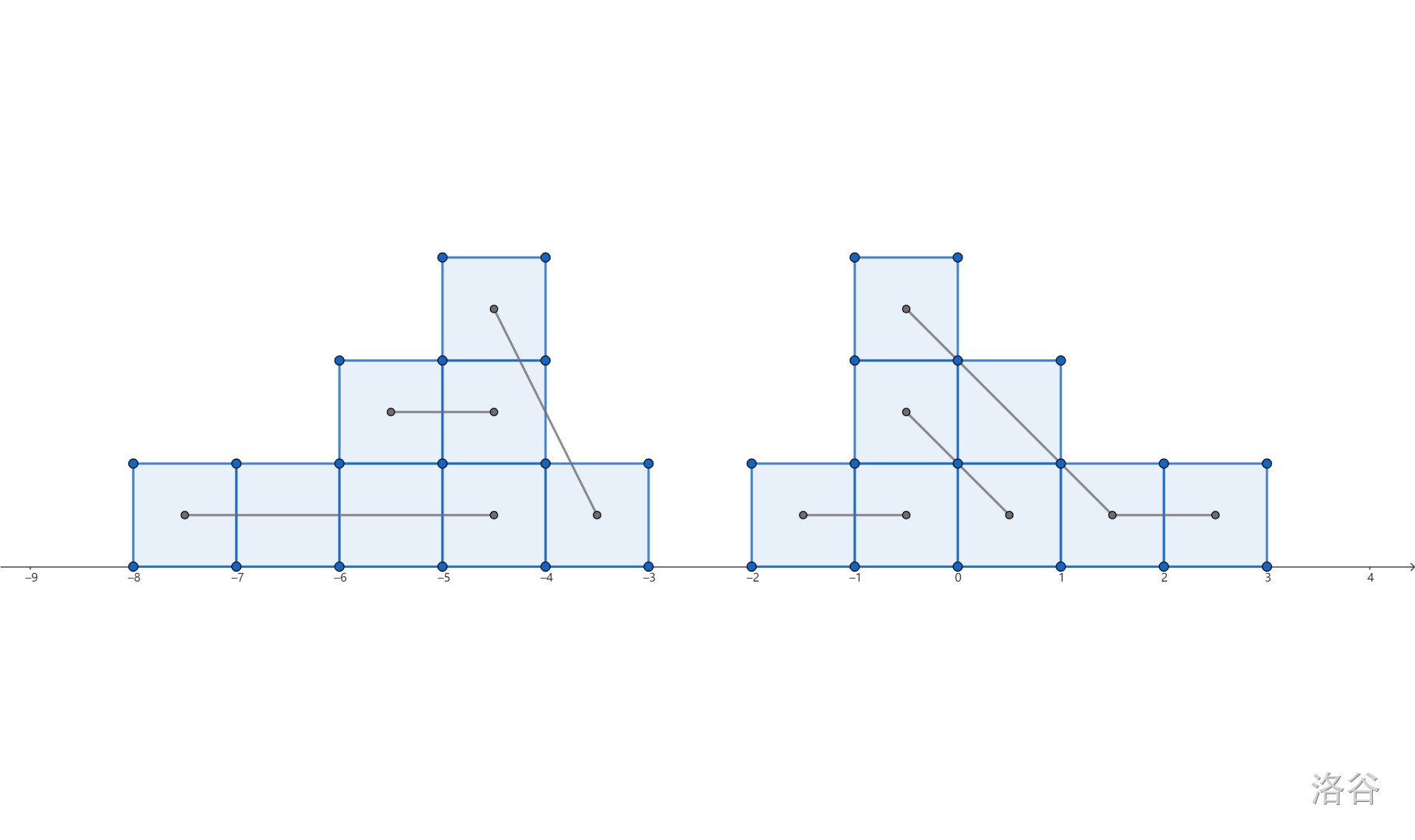 那么分组其实就是在数轴上画一条经过相连的方格的线。
