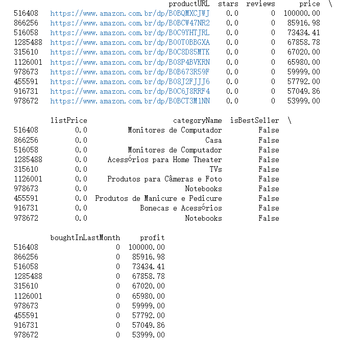 从CSV文件中读取了商品数据,计算了每条数据的利润,并找出了利润最高的前10个商品,最后将这10个商品的信息打印出来。