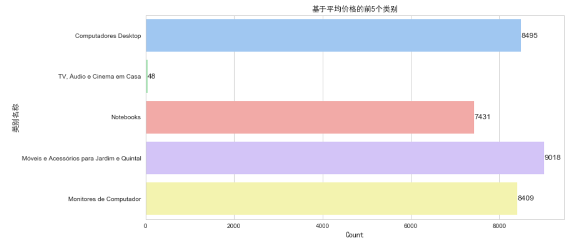 通过条形图,可以直观地看到前五个平均价格最高的类别及其数量。由于条形图按平均价格从高到低排列类别,因此可以直观地比较不同类别之间的平均价格。通过观察条形图的形状和高度,可以发现数据中的模式和趋势,例如哪些类别可能更受欢迎或更昂贵。这种类型的图表可以为企业决策者提供有用的信息,帮助他们了解哪些类别可能是最有利可图的或需要更多关注的。