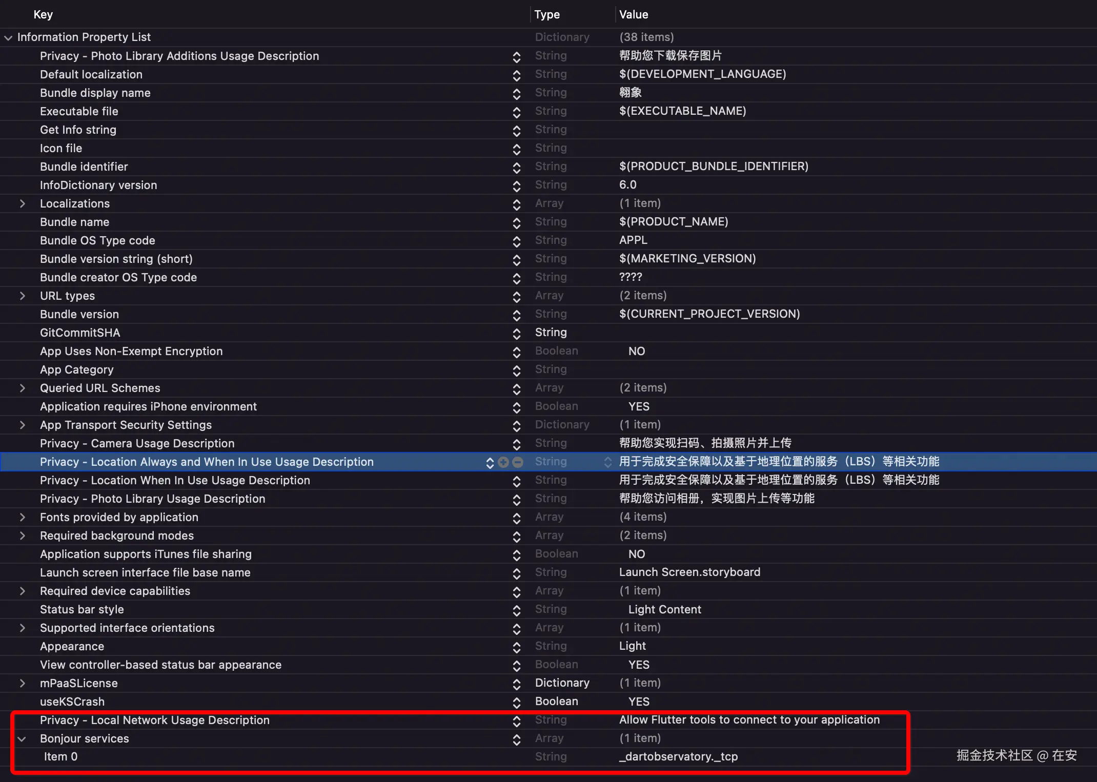 <key>NSLocalNetworkUsageDescription</key> <string>Allow Flutter tools to connect to your application</string> <key>NSBonjourServices</key> <array> <string>_dartobservatory._tcp</string> </array>