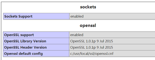 ↑ 使用 phpinfo() 函数查看 socket 和 openssl 扩展信息(wamp server 默认启用了该扩展)。