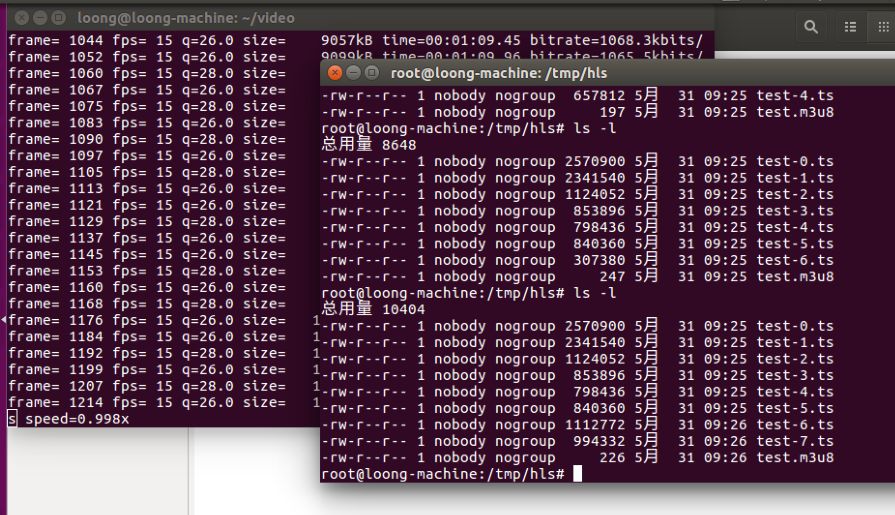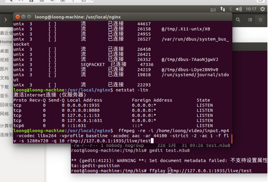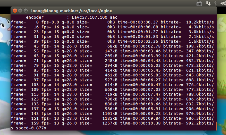 ffmpeg -re -i /home/loong/video/input.mp4 -vcodec libx264 -vprofile baseline -acodec aac -ar 44100 -strict -2 -ac 1 -f flv -s 1280x720 -q 10 rtmp://127.0.0.1:1935/hls/test