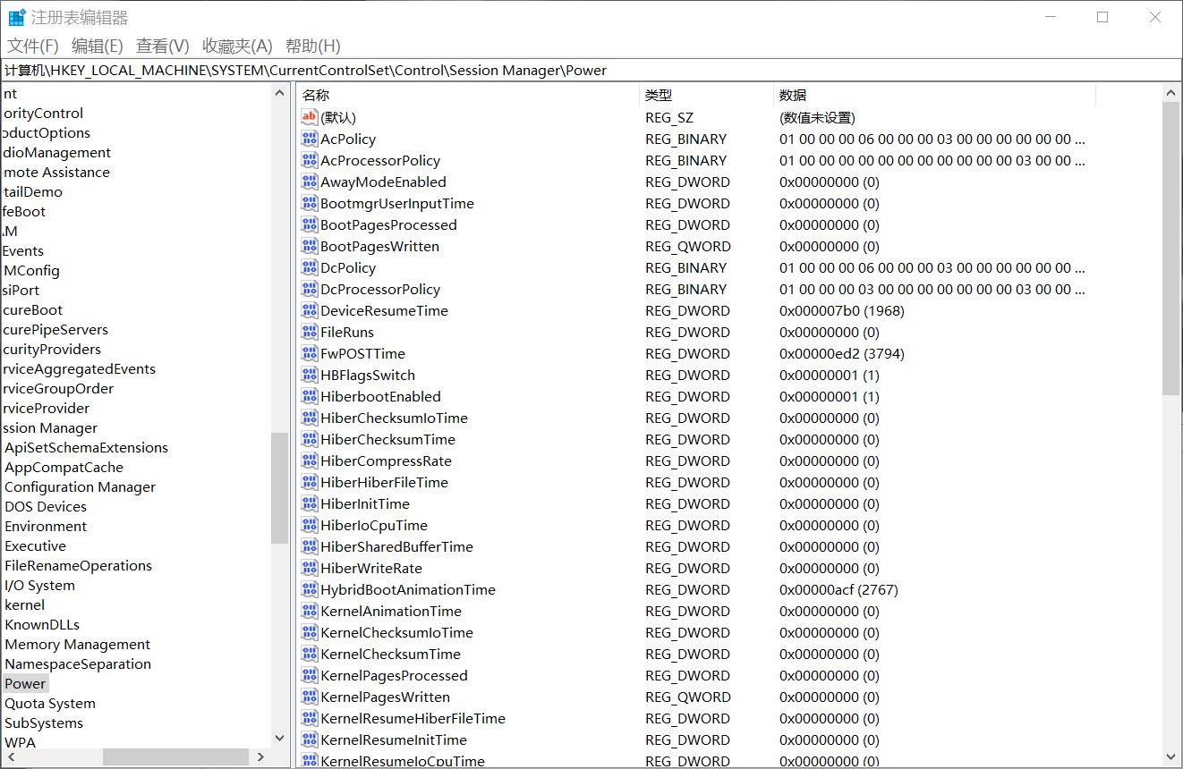 - 定位到>> *计算机\HKEY_LOCAL_MACHINE\SYSTEM\CurrentControlSet\Control\Session Manager\Power*