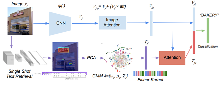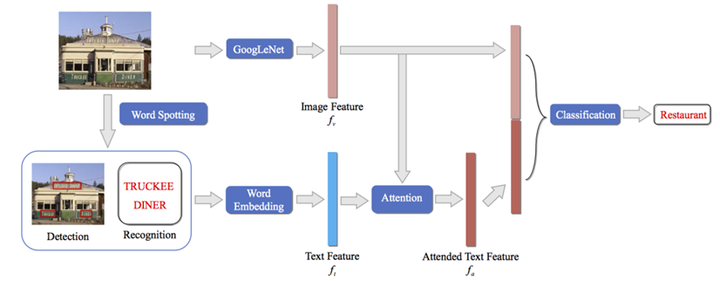 如图2所示,算法[1]融合图像的视觉特征和图像中的场景文本特征来联合分类。具体地,通过GoogLeNet提取图像的视觉特征。利用现有的Word Spotting算法识别出图像中潜在的场景文本实例。并将每个识别出的场景文本通过Word2Vector的方法,将场景文本实例转化为特征。然而,并不是每个文本实例都有助于识别该图像,因此,通过注意力模型,以图像特征作为信号,关注于和图像内容高度相关的文本实例特征。最后,对经过注意力模型的文本特征和视觉特征联合分析,分辨图像目标的类别。其注意力模型如图3所示,视觉特征和文本实例特征共同输入,计算出每个文本实例特征的权值,随后,用计算出的权值加权到文本特征中,得到加权后的文本特征。