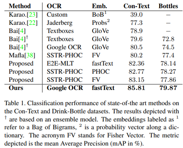 从实验结果可以看出,通过引入场景文本和通用目标进行联合推理分析,算法整体的分类性能得到大幅度提升。以上方法充分说明将场景文本引入到图像分析中的必要性,除图像分类任务之外,场景文本所提供的信息能够有效用于VQA,图像检索,Visual grounding等任务之中。