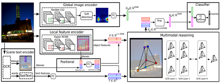 方法[1][2]只考虑图像的全局信息,没有考虑图像的局部区分性特征。为此方法[3]不仅提取图像的场景文本特征,而且利用图像中的通用目标信息,联合通用目标和场景文本共同推理、分析图像内容。如图5所示,通过ResNet152提取图像的全局信息,Faster-RCNN提取图像中的通用目标特征。之后,将通用目标特征和场景文本实例特征输入图卷积神经网络,推理分析出增强后的特征。将增强后的的特征和图像全局特征一起输入给分类器进行分类。