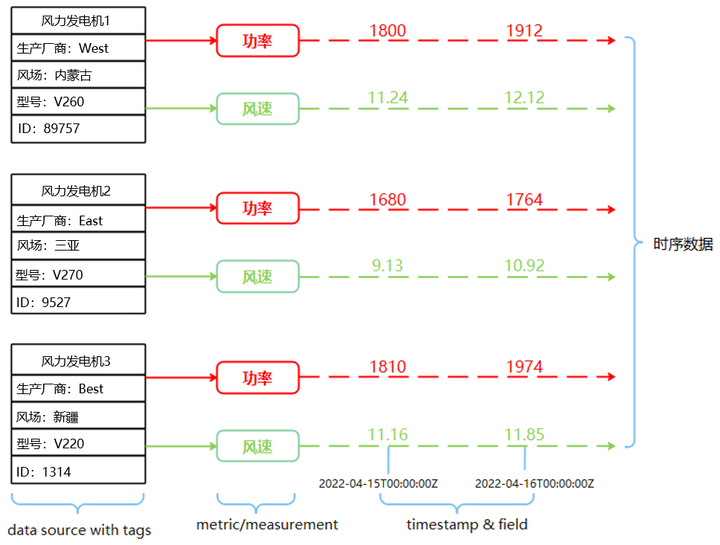 - 标签(tag):描述数据源特征,通常不随时间变化,例如图中的生产厂商、风场地址、型号和ID。