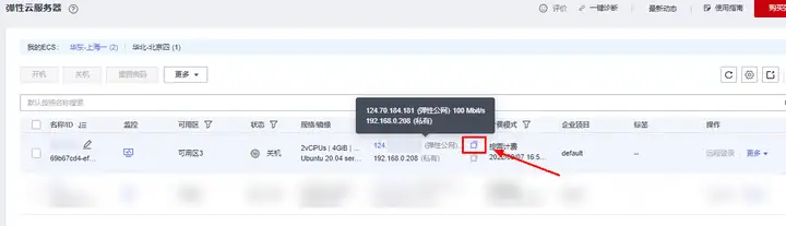 通过控制台找到 ECS 服务,即可看到自己刚刚购买的服务器,服务器创建完成后这里的 IP 即为你的公网 IP,点击旁边按钮复制下来。