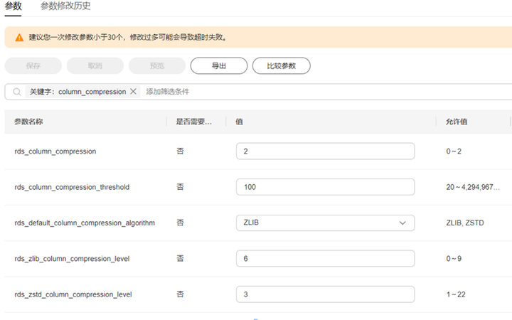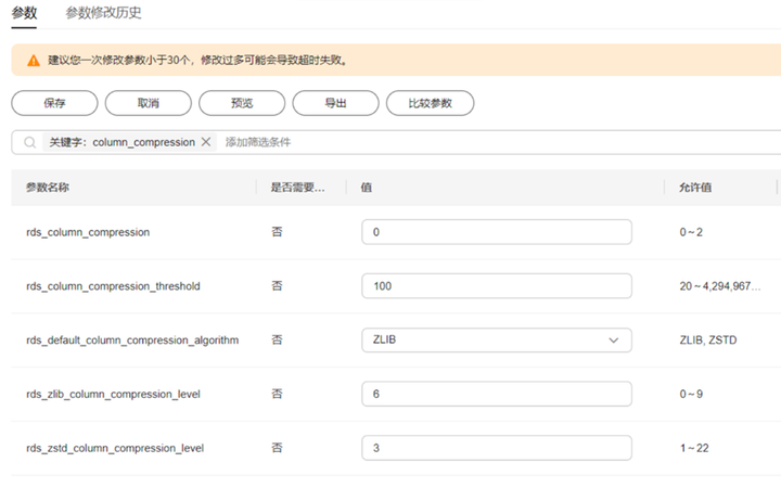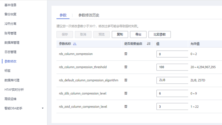 为了使得TaurusDB字段压缩特性更方便地被用户所使用,已开放5个相关参数,在“实例管理”处点击“参数修改-参数”页面即可调整字段压缩参数,如图5所示。