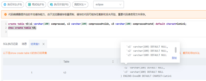create table t1(c1 varchar(100) compressed, c2 varchar(100) compressed=zlib, c3 varchar(100) compressed=zstd) default charset=latin1;