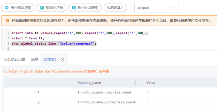 通过查询status信息,来确认字段压缩/解压缩接口的实际调用次数。例如,在将参数设置为rds_column_compression_threshold=20之后,对上述t1表进行插入数据以及查询数据操作,执行如下SQL语句,