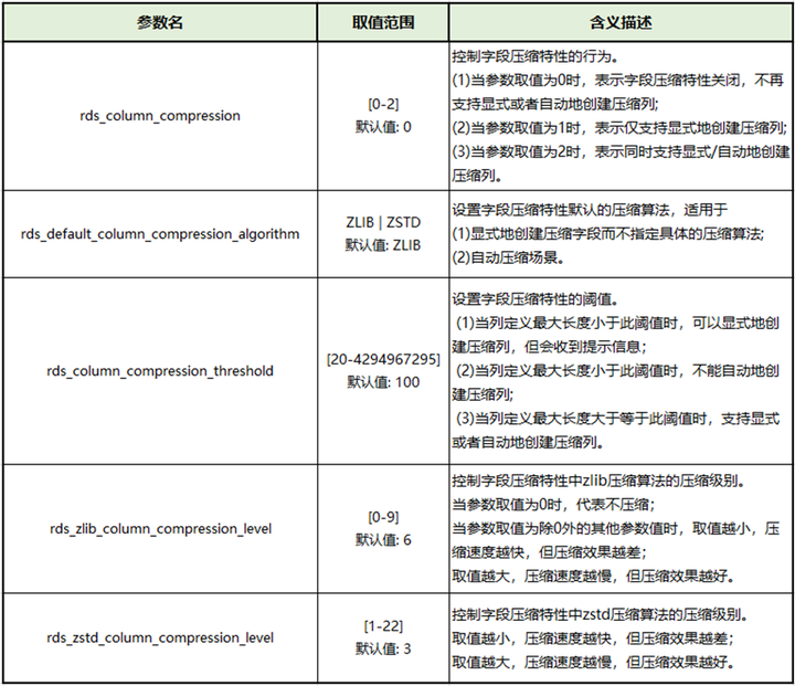 例如,自动地创建压缩字段(如图8,设置字段压缩阈值参数rds_column_compression_threshold=100,设置默认压缩算法参数rds_default_column_compression_algorithm=ZLIB),SQL语句不需要改造,自动对符合条件的列添加压缩属性。