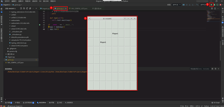 新建一个game.py文件,将代码粘贴进去,点击右上角“运行”按钮,运行game.py文件,查看运行效果。