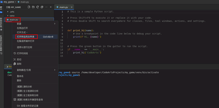 将复制的代码文件粘贴到创建的Python工程路径下,快速进入路径方法如下图所示,在CodeArts IDE for Python中,鼠标右击“mian.py”文件,选择“打开所在文件夹”。