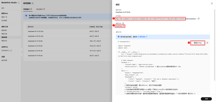 在滑出的“调用”窗口中,model的值填写“模型名称”的值,如图中的“DeepSeek-V3”;api_key的值填写“API地址”中截止到“v1”前的部分,如图中的https://infer-modelarts-cn-southwest-2.modelarts-infer.com/v1/infers/707c01c8-517c-46ca-827a-d0b21c71b074/v1;点击“管理API Key”。