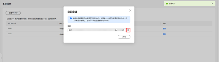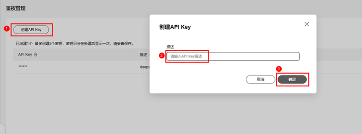 进入“鉴权管理”页面,点击“创建API Key”,自定义输入API Key描述,点击“确定”,完成API Key的创建。