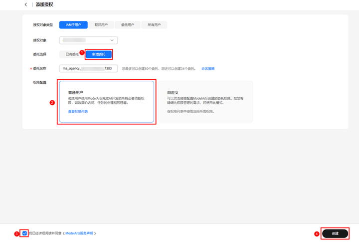 2、添加授权页面中,选择“新增委托>普通用户”,勾选服务声明,点击“创建”。