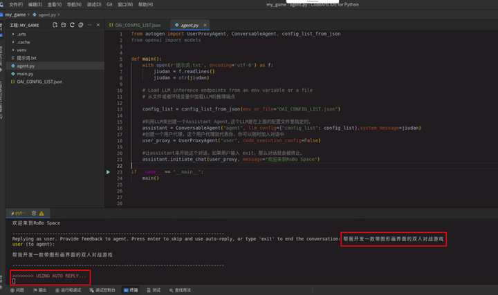 例如输入:“帮我开发一款带图形画界面的双人对战游戏”(可自定义输入对话内容),回车发送对话内容。