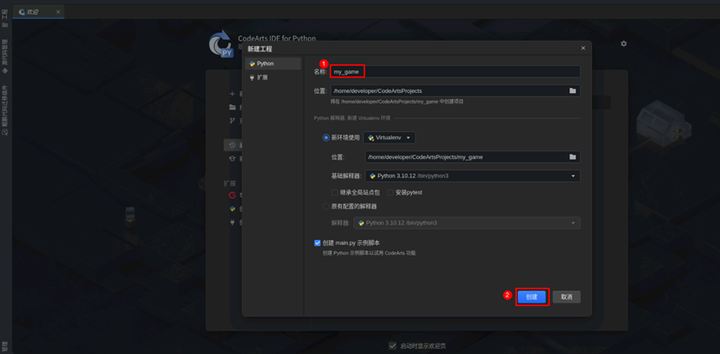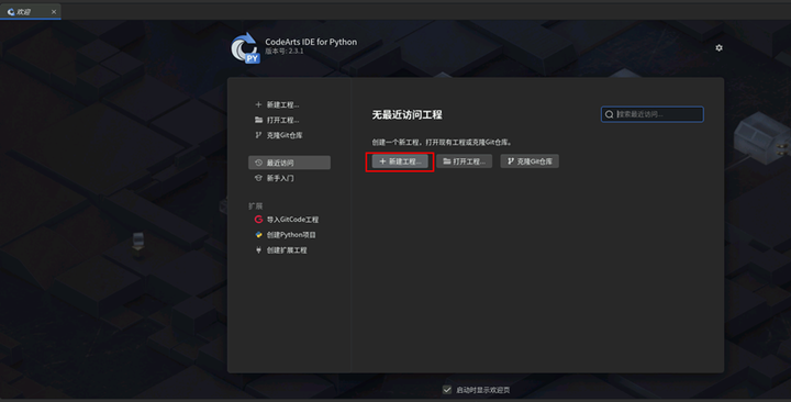 CodeArts IDE for Python 启动后,在弹框界面,选择“新建工程”。