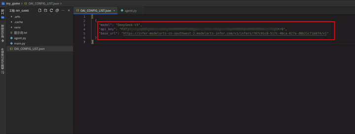 CodeArts IDE for Python中打开OAI_CONFIG_LIST.json文件,其中有3个参数的值需要配置,参数说明参考下表: