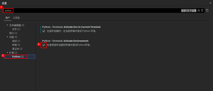 选择“文件”-“设置”,在搜索框中输入“active”,在下面筛选出的结果中找到“在使用插件创建的终端中激活Python环境。”并勾选。