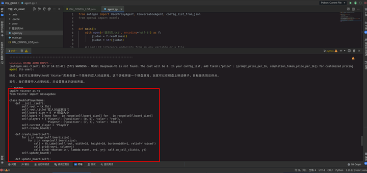 如果对返回代码的效果不满意,或者代码中存在问题,可以在“终端”中继续与DeepSeekV3对话,提出自己的要求(越具体越好)完善代码。