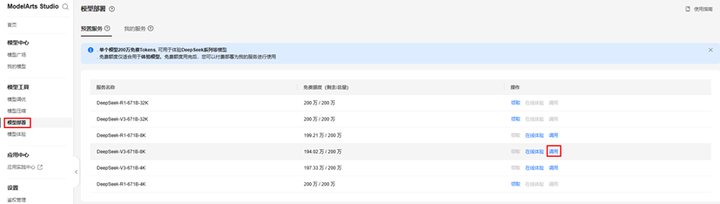 进入ModelArts Studio控制台首页,在左侧菜单栏,选择“模型部署”,点击在步骤2.2中领取的DeepSeek V3模型对应的“调用”。