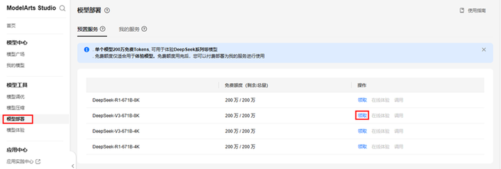 进入ModelArts Studio控制台首页,在左侧菜单栏,选择“模型部署”,在“预制服务”中选择DeepSeek-V3-671B-8K模型,点击“领取”,领取200万免费token。