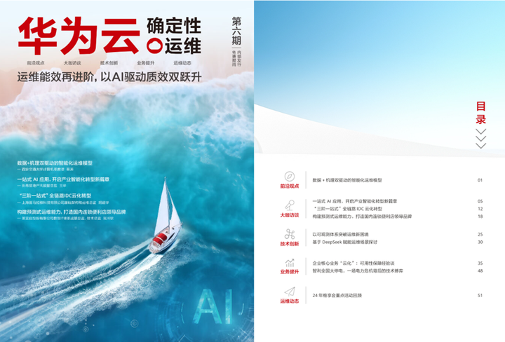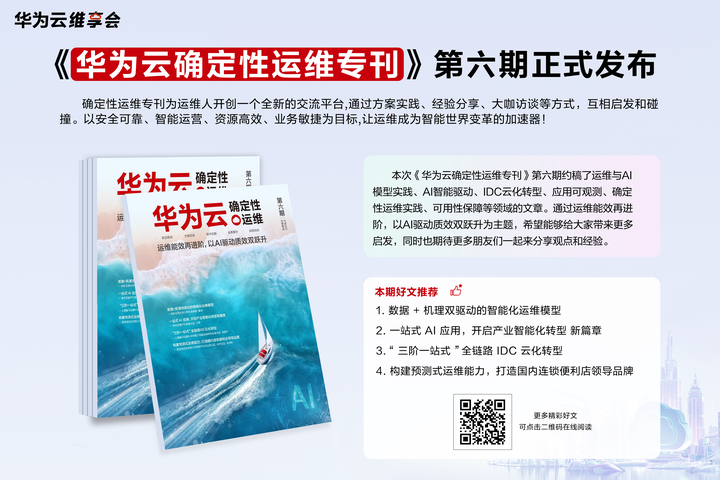 本次《华为云确定性运维专刊》第六期约稿了运维与AI模型实践、AI智能驱动、IDC云化转型、确定性运维实践、可用性保障等领域的文章。围绕“运维能效再进阶,以AI驱动质效双跃升”为主题,希望能够给大家带来更多启发,同时也期待更多朋友们一起来分享观点和经验。