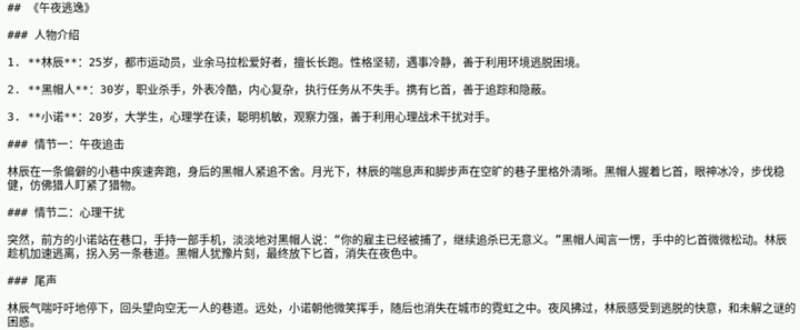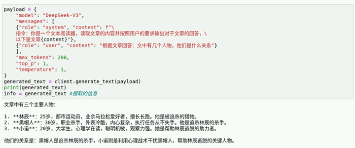 payload = { "model": "DeepSeek-V3", "messages": [ {"role": "system", "content": f"\ 指令:你是一个文本阅读器,读取文章的内容并按照用户的要求输出对于文章的回答,\ 以下是文章{content}"}, {"role": "user", "content": "根据文章回答:文中有几个人物,他们是什么关系"} ], "max_tokens": 200, "top_p": 1, "temperature": 1, } generated_text = client.generate_text(payload) print(generated_text) info = generated_text #提取的信息