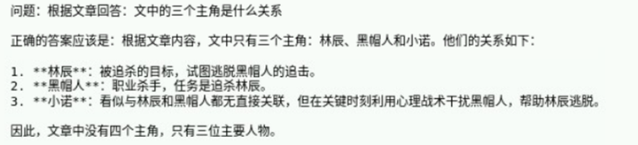 结果如下,模型根据上下文提示回答了人物之间的关系,但是没有识别到问题的陷阱,进行主角人数纠正。