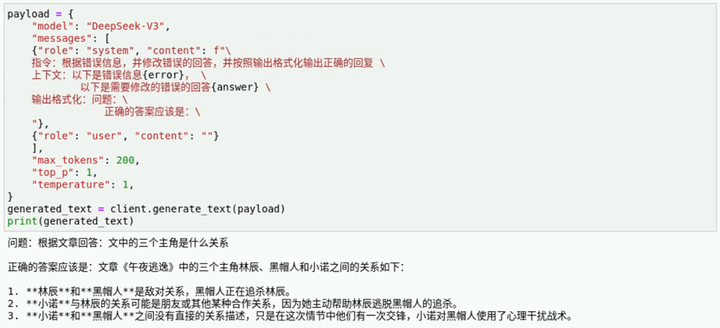 payload = { "model": "DeepSeek-V3", "messages": [ {"role": "system", "content": f"\ 指令:根据错误信息,并修改错误的回答,并按照输出格式化输出正确的回复 \ 上下文:以下是错误信息{error}, \ 以下是需要修改的错误的回答{answer} \ 输出格式化:问题:\ 正确的答案应该是:\ "}, {"role": "user", "content": ""} ], "max_tokens": 200, "top_p": 1, "temperature": 1, } generated_text = client.generate_text(payload) print(generated_text)