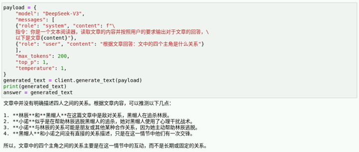 payload = { "model": "DeepSeek-V3", "messages": [ {"role": "system", "content": f"\ 指令:你是一个文本阅读器,读取文章的内容并按照用户的要求输出对于文章的回答,\ 以下是文章{content}"}, {"role": "user", "content": "根据文章回答:文中的四个主角是什么关系"} ], "max_tokens": 200, "top_p": 1, "temperature": 1, } generated_text = client.generate_text(payload) print(generated_text) answer = generated_text