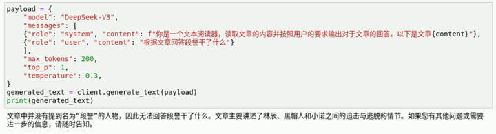 payload = { "model": "DeepSeek-V3", "messages": [ {"role": "system", "content": f"你是一个文本阅读器,读取文章的内容并按照用户的要求输出对于文章的回答,以下是文章{content}"}, {"role": "user", "content": "根据文章回答段誉干了什么"} ], "max_tokens": 200, "top_p": 1, "temperature": 0.3, } generated_text = client.generate_text(payload) print(generated_text)