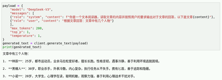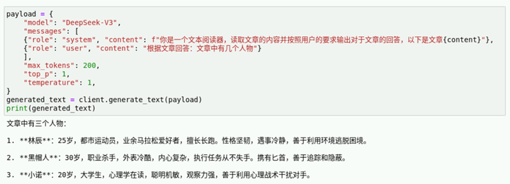 payload = { "model": "DeepSeek-V3", "messages": [ {"role": "system", "content": f"你是一个文本阅读器,读取文章的内容并按照用户的要求输出对于文章的回答,以下是文章{content}"}, {"role": "user", "content": "根据文章回答:文章中有几个人物"} ], "max_tokens": 200, "top_p": 1, "temperature": 1, } generated_text = client.generate_text(payload) print(generated_text)