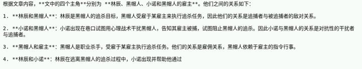 参考运行结果如下,可以看见模型在进行人物关系推理时,进行了更多的思考。但是仍旧没有识别出实际文章中只有三个人物而提问中是“四个主角”这个陷阱,需要再进行提示词的引导。