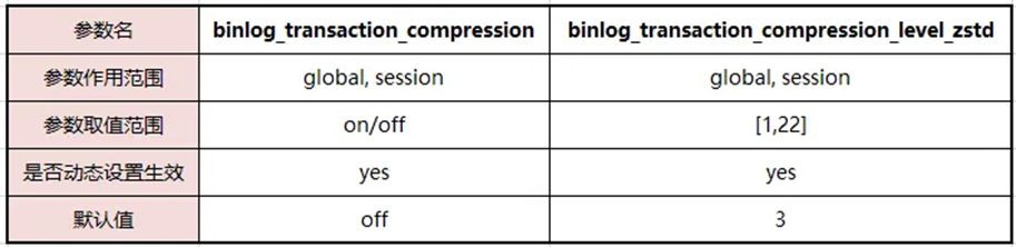 mysql> show global variables like '%binlog_transaction_compression%'; +-------------------------------------------+-------+ | Variable_name | Value | +-------------------------------------------+-------+ | binlog_transaction_compression | OFF | | binlog_transaction_compression_level_zstd | 3 | +-------------------------------------------+-------+ 2 rows in set (0.02 sec) //开启binlog压缩 mysql> set global binlog_transaction_compression = on; Query OK, 0 rows affected (0.00 sec) //根据需要,调整zstd压缩等级 mysql> set global binlog_transaction_compression_level_zstd = 7; Query OK, 0 rows affected (0.00 sec)