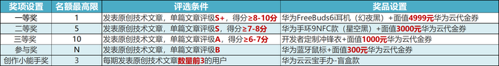 1、获奖案例将有机会作为华为云开发者空间应用的标杆案例,进行录入成册推广宣传,并发布到华为云开发者联盟公众号传播矩阵。同时,案例内容可作为后续作者申请评选HCDE的相关贡献内容。