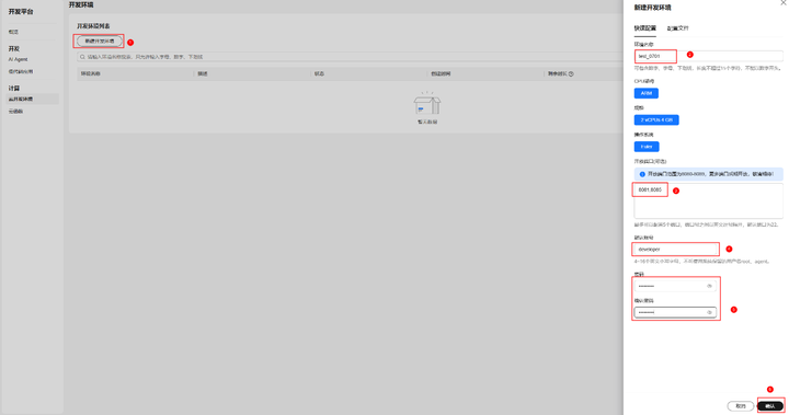 无需复杂配置,只需登录华为开发者空间,点击 “新建开发环境”,填写名称即可完成创建。CPU 架构、操作系统等参数默认优化,支持自定义端口(8080-8089),满足多样化开发需求。