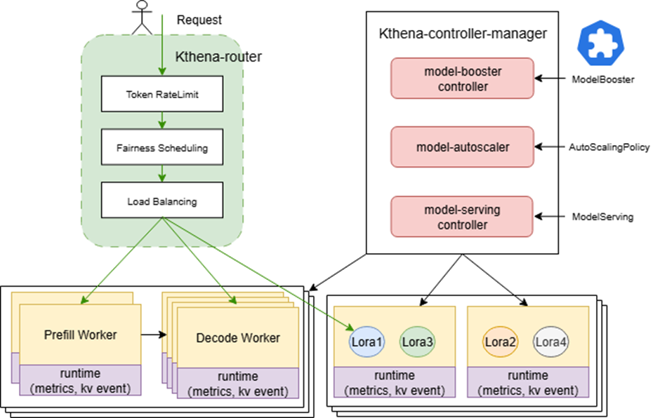 2) Kthena Controller Manager:Kubernetes 控制平面的控制器,它主要包含多种控制器,负责 LLM 工作负载的编排与生命周期管理。它持续调谐并联动多类 CRD(如 `ModelBooster`、`ModelServing`、`AutoScalingPolicy`/`AutoScalingPolicyBinding`、以及 `ModelRoute`/`ModelServer`),将声明式API转化为运行时资源:ModelServing 控制器编排 `ServingGroup` 与 `Prefill/Decode` 角色分组;支持网络拓扑亲和调度和Gang调度、滚动升级与故障恢复;基于 `AutoScalingPolicy` 实现弹性扩缩容。
